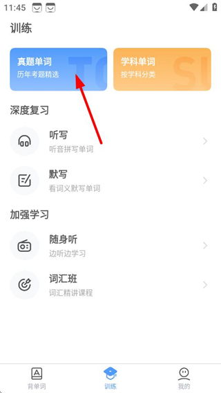 2、進入訓(xùn)練頁面后,點擊真題單詞選項,可進入真題單詞的素材分類頁面。
