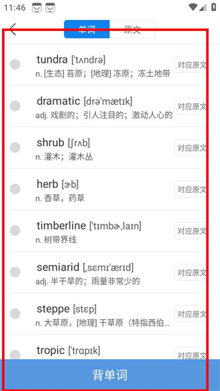 4、在單詞列表頁面,選擇單詞,點擊背單詞即可開始背誦該組單詞。