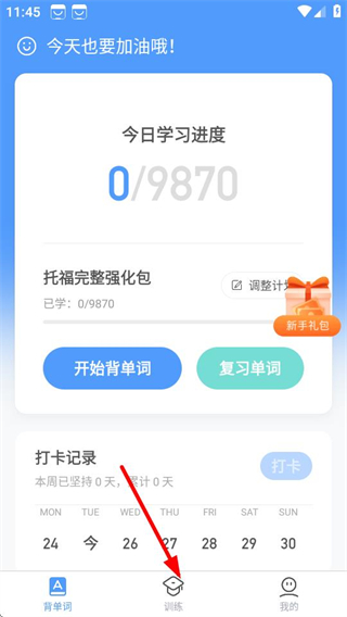 1、在托福單詞首頁,點擊底部導(dǎo)航欄的訓(xùn)練選項,可進入訓(xùn)練功能頁面。