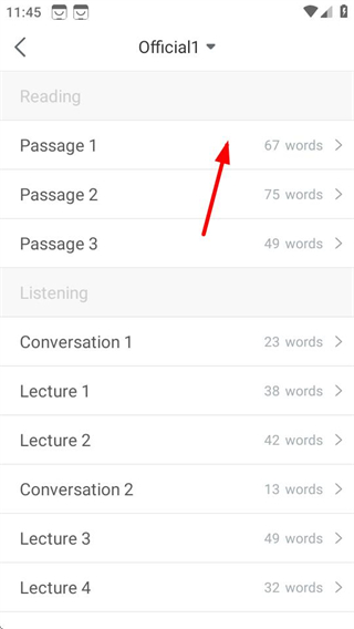 3、在真題單詞頁面,點擊目標素材,可進入該素材對應(yīng)的單詞列表頁面。