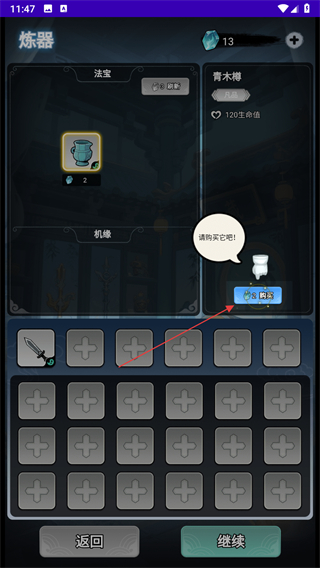 1、進(jìn)入游戲后,在煉器界面,點(diǎn)擊購買需要的煉器品。