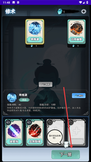 2、購買完之后,進(jìn)入修術(shù)界面,學(xué)習(xí)購買技能,點(diǎn)擊下一層。