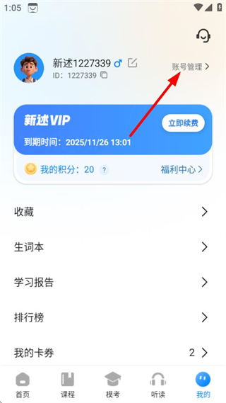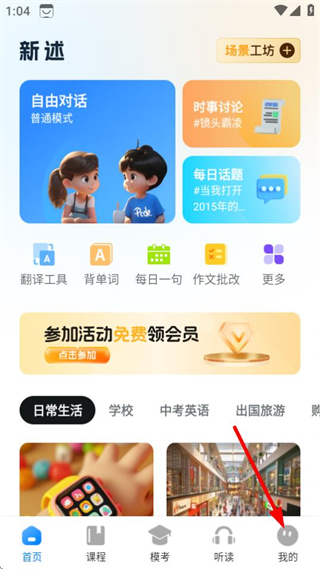 1、在新述口語首頁,點擊底部導航欄的我的選項,可進入個人中心頁面。