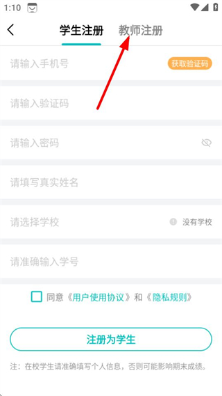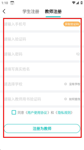 3、填寫信息,勾選協(xié)議后點(diǎn)擊注冊(cè)為教師即可完成教師賬號(hào)注冊(cè)。
