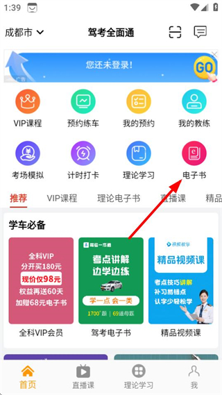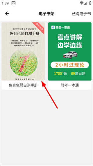 1、在駕考全面通首頁,點擊電子書選項進入電子書架頁面。