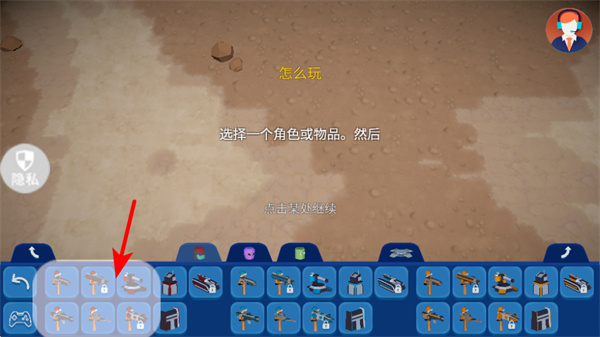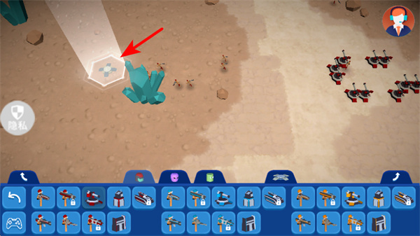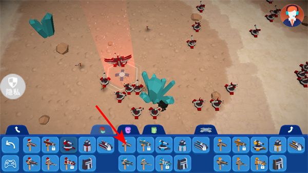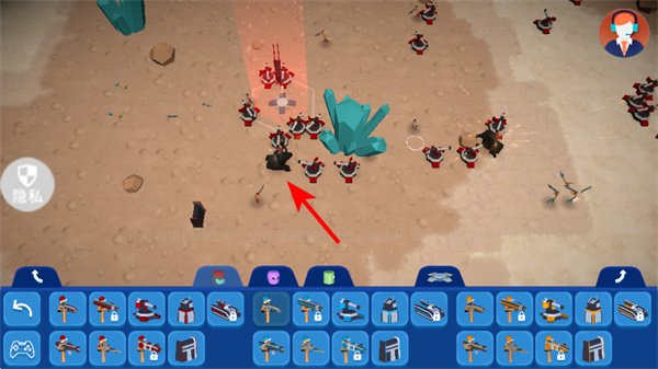3、根據(jù)戰(zhàn)場局勢,再次點擊底部欄的其他單位圖標如紅色箭頭指向的武器,選擇作戰(zhàn)單位,補充戰(zhàn)力應對敵方攻勢。
