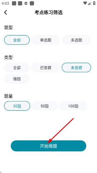 4、在考點練習(xí)篩選頁面選好條件后,點擊開始做題,進入考點練習(xí)做題頁面。