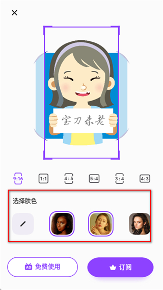 4、在拼圖編輯界面,可選擇畫面比例,還可在選擇膚區(qū)域選擇不同膚色。