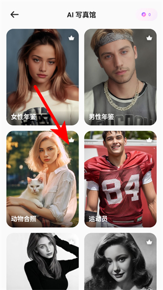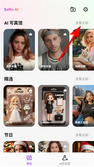 1、打開愛自拍APP,在AI寫真館區(qū)域點擊查看全部,進入模板選擇頁面。