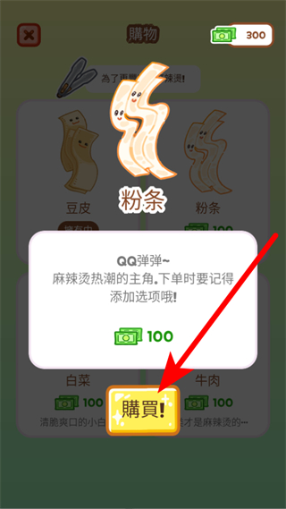 4、選擇需要的食材如粉條,點擊“購買!”按鈕完成該食材的采購,繼續(xù)集齊食材。