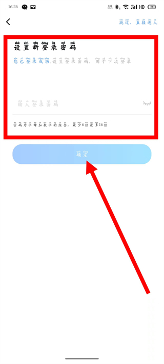 5、在設(shè)置密碼頁(yè)面,輸入6-16位登錄密碼,點(diǎn)擊確定,完成注冊(cè)登錄。