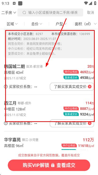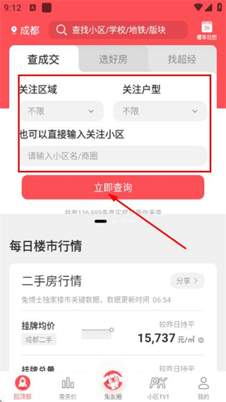 1、在查成交頁面選擇區(qū)域、戶型或填寫小區(qū)名、商圈,點擊立即查詢獲取成交信息。