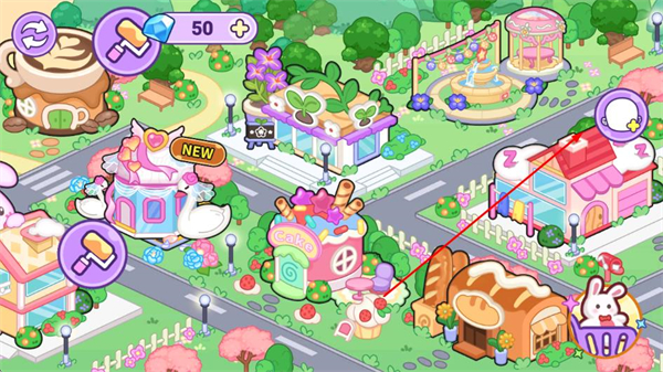 小鎮(zhèn)建筑不僅是裝飾元素,還可通過互動解鎖新裝扮道具如咖啡屋互動獲取鉆石,角色也能放置形成場景互動,經(jīng)營與裝扮相互推動,讓玩法更具連貫性。
