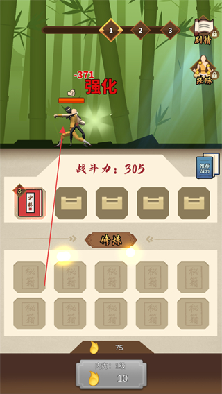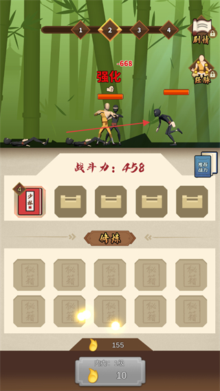 4、持續(xù)合成高等級(jí)武學(xué)、消耗資源強(qiáng)化,逐步提升戰(zhàn)斗力推進(jìn)關(guān)卡。