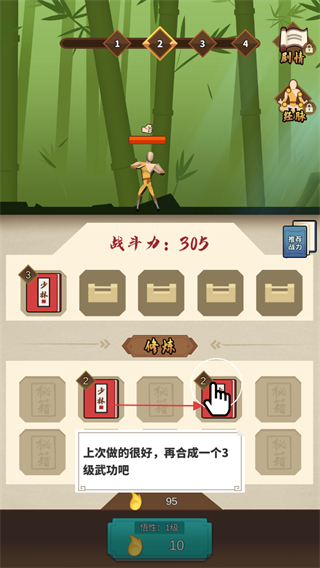 2、把相同等級(jí)的武學(xué)卡片合成如2級(jí)合成3級(jí),解鎖更高等級(jí)武學(xué),提升戰(zhàn)力。