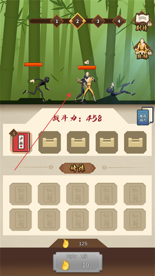 1、將低等級(jí)武學(xué)卡片如2級(jí)拖動(dòng)到修煉欄,消耗資源強(qiáng)化提升戰(zhàn)斗力。