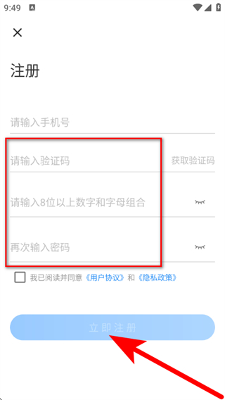 4、在輸入框填入驗證碼、設(shè)置密碼,勾選協(xié)議后,點擊立即注冊,完成注冊。