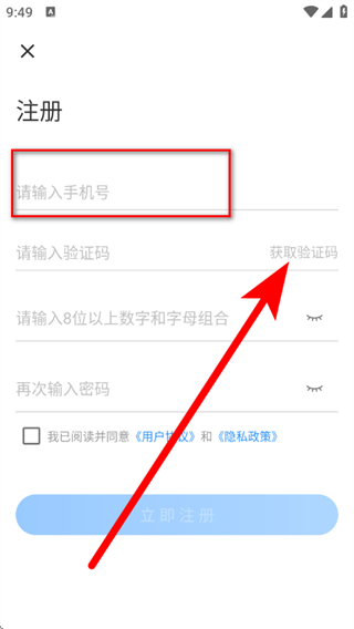 3、在注冊頁面,在請輸入手機號,輸入框填寫信息,點擊獲取驗證碼。