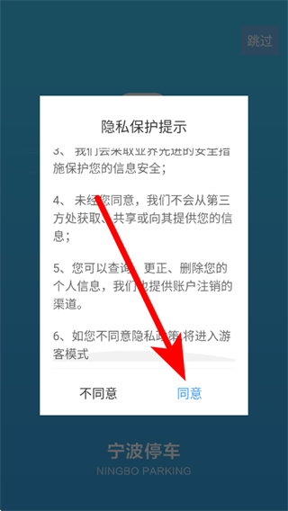 1、打開寧波停車,在彈出的彈窗中,點擊同意按鈕。
