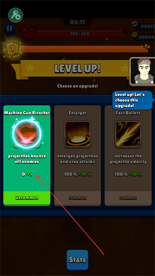 3、升級后選擇MachineGunRicochet升級項,解鎖子彈反彈效果,提升攻擊效率。