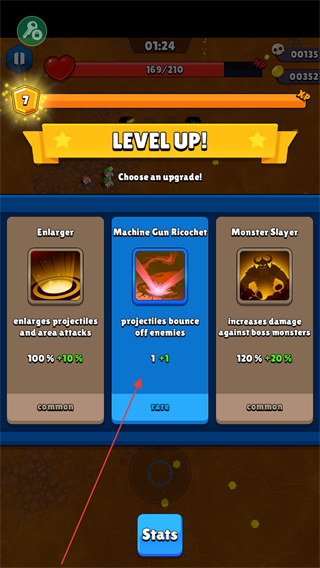 1、升級時選擇MachineGunRicochet,強化子彈反彈效果,提升對僵尸的群體攻擊能力。