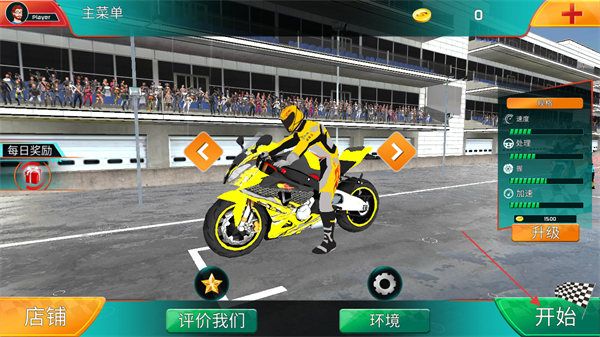 1、打開極速騎行4游戲主頁,點(diǎn)擊右下角的開始按鈕進(jìn)入比賽模式選擇。