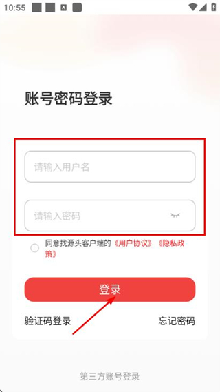 3、在賬號密碼登錄頁面填寫用戶名和密碼,勾選相關(guān)協(xié)議后點(diǎn)擊登錄完成賬號登錄操作。