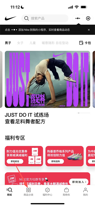 1、在耐克首頁,點擊底部導航欄的商品分類選項,進入商品分類頁面。