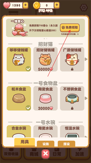 3、點擊下方的商城,可以每日免費領(lǐng)取五次大量愛心幫助玩家更好的照顧小貓。