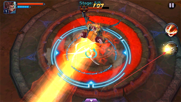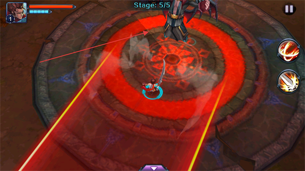 1、進(jìn)入Stage:5/5的Boss戰(zhàn),操控英雄躲避Boss技能,同時(shí)持續(xù)攻擊Boss削減其血量。