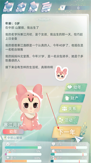 1、打開當代人生游戲,在角色出生時開始游戲,點擊下方的下一年按鈕增長歲數(shù)。