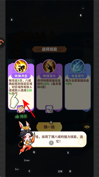 3、在技能選擇界面中點(diǎn)擊肉彈沖擊技能選項(xiàng),該技能會(huì)為對(duì)應(yīng)角色附加攻擊變八次,八戒進(jìn)入該區(qū)域所有人造成110%傷害的增益效果。