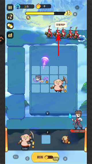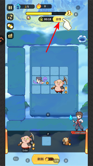 4、按照紅色箭頭指引,點(diǎn)擊界面上方的出戰(zhàn)按鈕,觸發(fā)新一輪的敵方單位進(jìn)攻,同時(shí)重置當(dāng)前的戰(zhàn)斗準(zhǔn)備狀態(tài),繼續(xù)推進(jìn)戰(zhàn)斗流程。