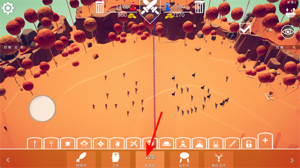 2、點(diǎn)擊下方功能欄中的長矛選項(xiàng),點(diǎn)擊后對應(yīng)數(shù)量的長矛單位會(huì)加入人群,強(qiáng)化隊(duì)伍的戰(zhàn)斗能力,同時(shí)資源數(shù)值會(huì)對應(yīng)消耗。