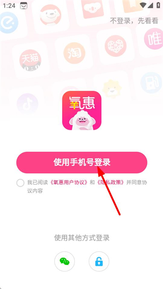 1、在氧惠購物首頁,點(diǎn)擊立即登錄按鈕,進(jìn)入登錄選擇頁面。