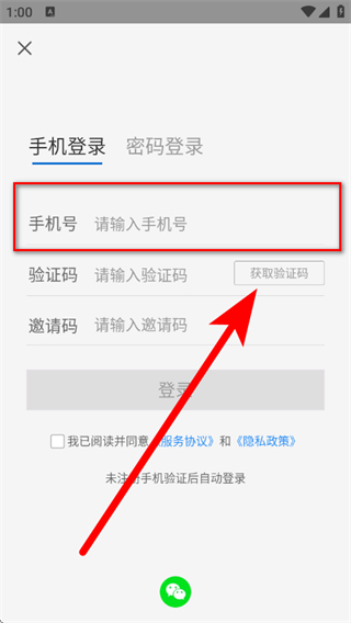3、在手機(jī)登錄頁面,輸入手機(jī)號,點(diǎn)擊獲取驗(yàn)證碼。