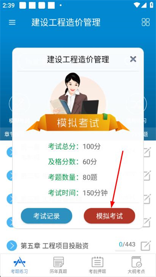 1、在考題練習(xí)頁面點擊模擬考試,彈出模擬考試說明窗口。