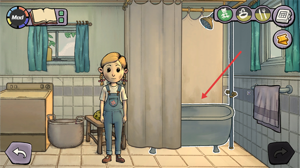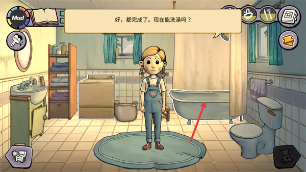 3、進(jìn)入浴缸區(qū)域后,按照提示,再次點(diǎn)擊浴缸,即可進(jìn)入浴缸洗澡。