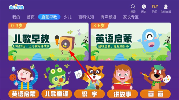 1、在幼兒早教首頁,點(diǎn)擊啟蒙早教選項,進(jìn)入啟蒙早教分類頁面。