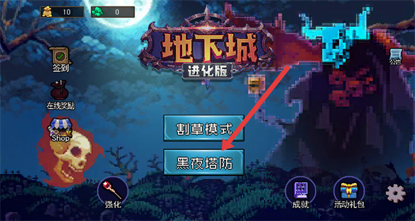 1、打開地下城進(jìn)化版游戲,在主界面點(diǎn)擊黑夜塔防模式進(jìn)行游玩。
