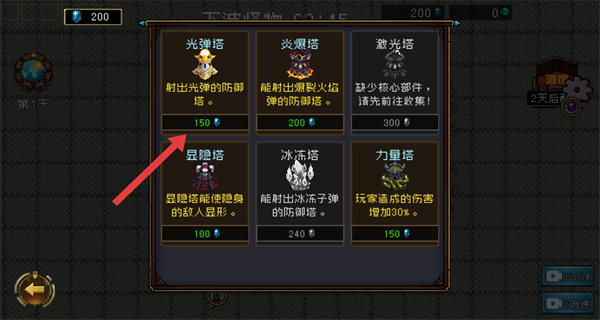 3、在防御塔選擇界面,選擇合適的防御塔消耗對應(yīng)的資源,進(jìn)行建造。