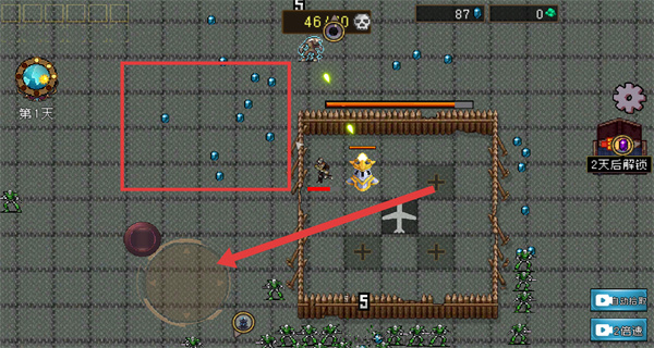 4、在開始后,可通過左下角的虛擬搖桿控制角色移動(dòng),收集掉落資源并躲避怪物。