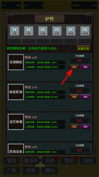 2、游戲中朝著紅色箭頭指引,點擊護(hù)符界面里深淵刺輪旁的升級按鈕,消耗對應(yīng)資源可提升護(hù)符等級。
