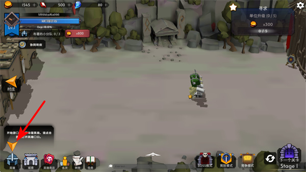 1、找到界面左側(cè)的開始戰(zhàn)斗按鈕,點(diǎn)擊后可觸發(fā)對(duì)戰(zhàn),同時(shí)能看到當(dāng)前幫助弱小村民的任務(wù)進(jìn)度。