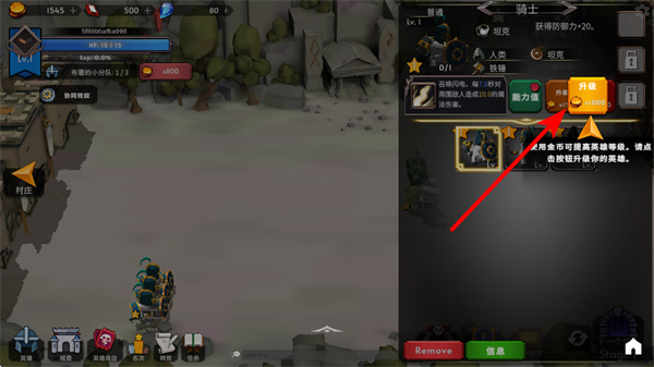 3、在單位界面中找到升級(jí)按鈕,消耗對(duì)應(yīng)金幣如500點(diǎn)擊它,可提升騎士等級(jí),強(qiáng)化其戰(zhàn)斗屬性。