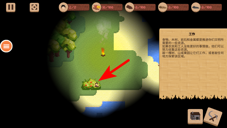 1、操控角色移動到果樹資源點,收集果實類資源,這是補充食物儲備的關(guān)鍵操作,充足的食物能保障居民生存,為后續(xù)發(fā)展提供基礎(chǔ)的生存保障。