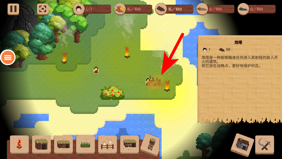 3、積累足夠資源后,點擊底部的炮塔建筑按鈕,在戰(zhàn)略點位搭建炮塔,這是防御建設(shè)的核心操作,炮塔可抵御外敵入侵,提升村莊的安全防護能力。