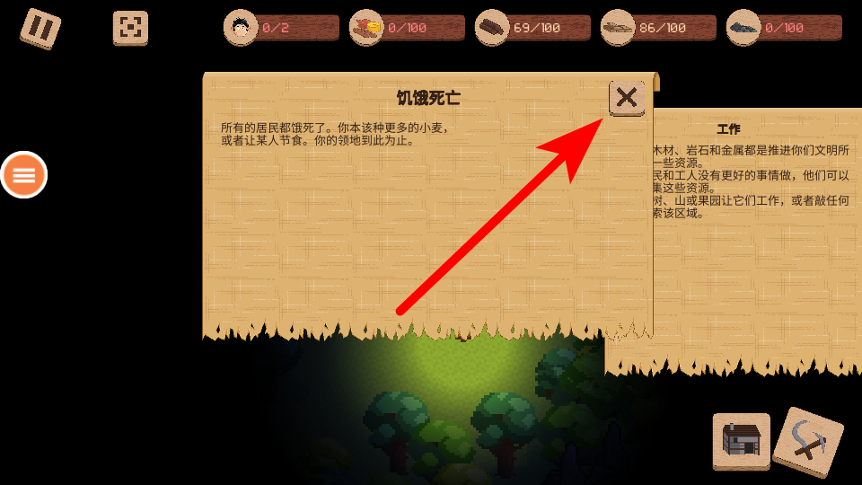 4、若出現(xiàn)饑餓死亡等失敗提示,點擊提示框的關(guān)閉按鈕,重新規(guī)劃資源分配,這是關(guān)鍵步驟,通過總結(jié)經(jīng)驗優(yōu)化資源管理,避免再次出現(xiàn)生存危機。