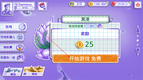 1、打開海戰(zhàn)棋2游戲,進入游戲關卡選項,選擇在線模式黑港競技場進行挑戰(zhàn)。