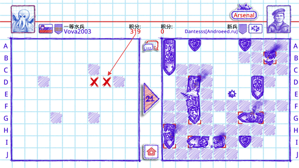 4、輪到我方回合時,選擇點擊敵方的棋盤如果出現紅色叉叉則代表炸到敵方戰(zhàn)艦可以繼續(xù)攻擊,否則輪換敵方攻擊。